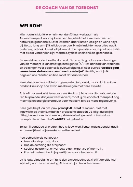 De wereld van coaching en therapie verandert snel. Kunstmatige intelligentie (AI) kan overweldigend lijken, maar biedt juist kansen om jouw werk makkelijker en krachtiger te maken. Deze premium gids van 18 pagina’s laat je stap voor stap zien hoe jij AI inzet als stille assistent.